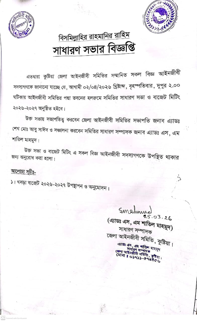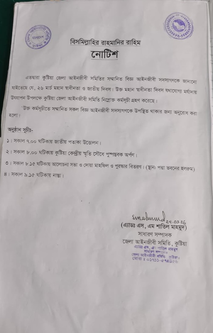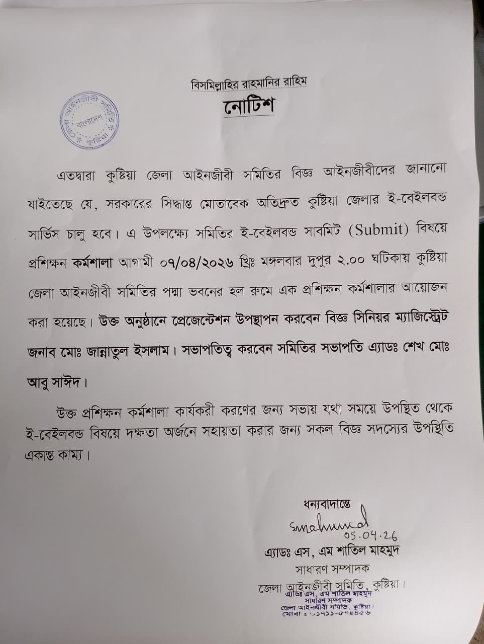 ই-বেইলবন্ড সাবমিট ( Submit) বিষয়ে প্রশিক্ষন কর্মশালা আগামি ০৭/০৪/২০২৬ খ্রিঃ মঙ্গলবার দুপুর ২.০০ ঘটিকায় কুষ্টিয়া জেলা আইনজীবী সমিতির পদ্মা ভবনের হল রুমে এক প্রশিক্ষন কর্মশালার আয়োজন করা হয়েছে।