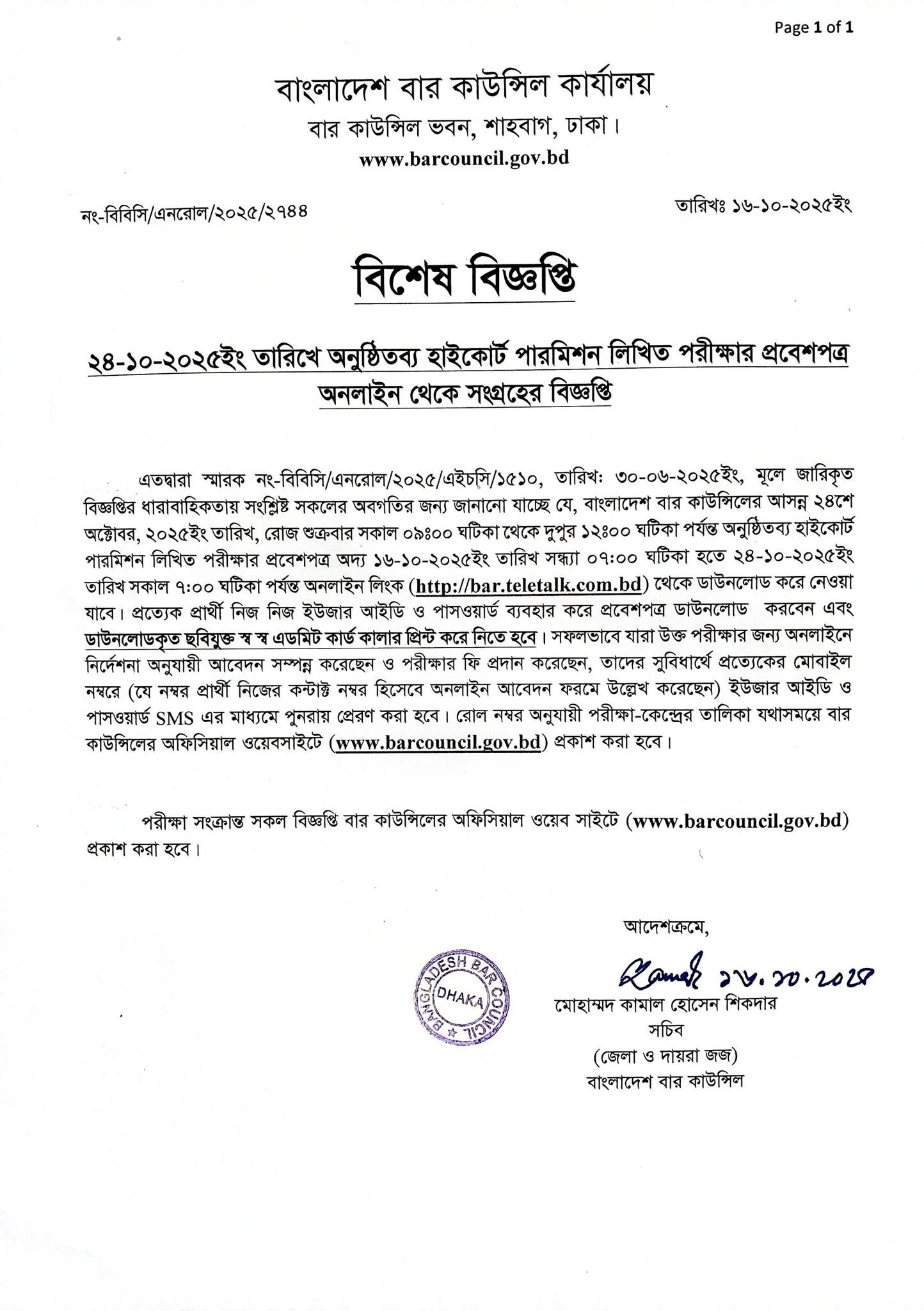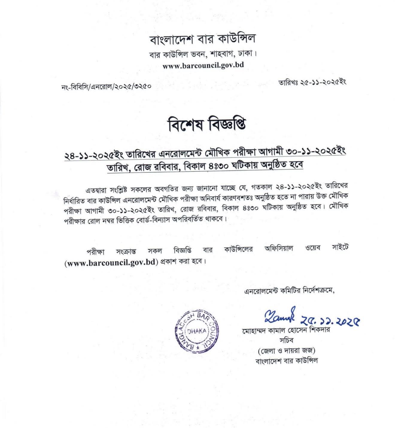 বাংলাদেশ বার কাউন্সিল এর স্বারক নং-বিবিসি/এনরোল/২০২৫/৩২২৫, গত ২৩-১১-২০২৫ ইং তারিখের এনরোলমেন্ট লিখিত পরীক্ষা সংক্রান্ত জরুরী বিজ্ঞপ্তি।