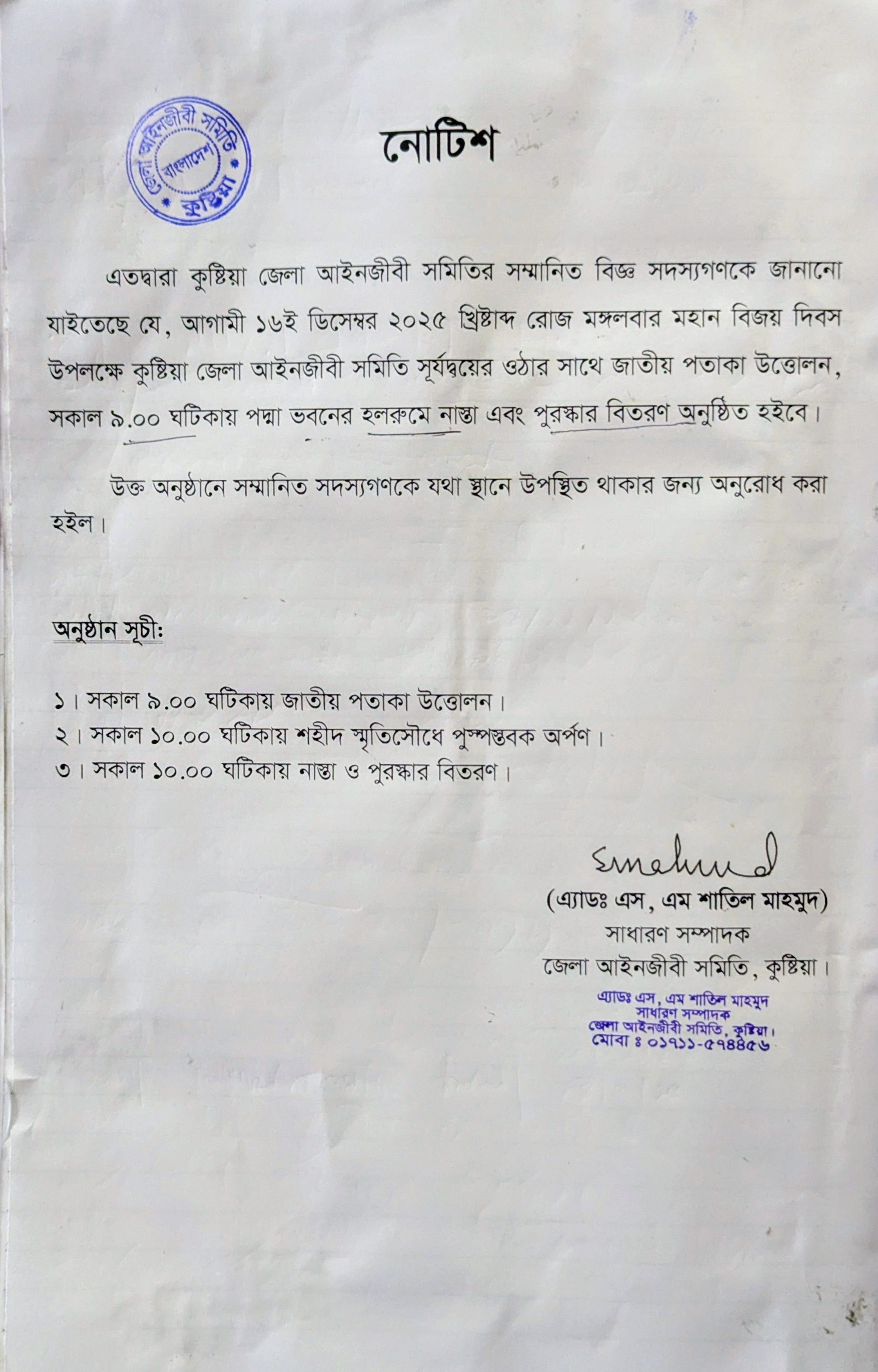 জেলা আইনজীবী সমিতি কুষ্টিয়া কর্তৃক বিজয় দিবস উপলক্ষে আয়োজিত পতাকা উত্তোলন অনুষ্ঠানের অংশবিশেষ।
